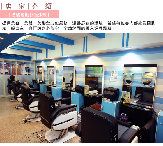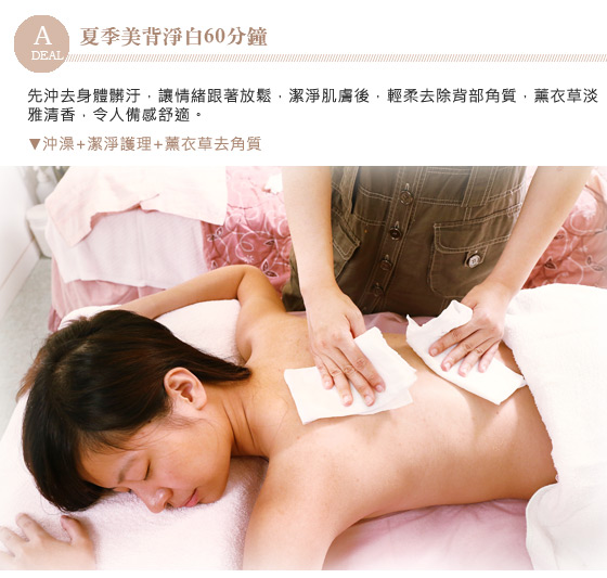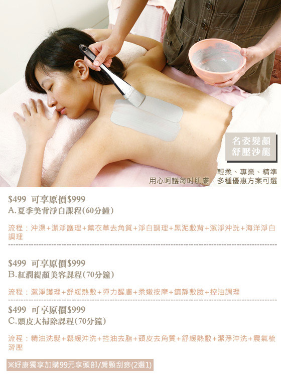 商品訊息簡述: 只要499元即可享受【名姿髮顏舒壓沙龍】原價999元美容美體方案:(A)夏季美背淨白課程(60分鐘)/(B)紅潤緹顏美容課程(70分鐘)/(C)頭皮大掃除課程(70分鐘),好康獨享加購99元享頭部/肩頸刮痧(2選1)。