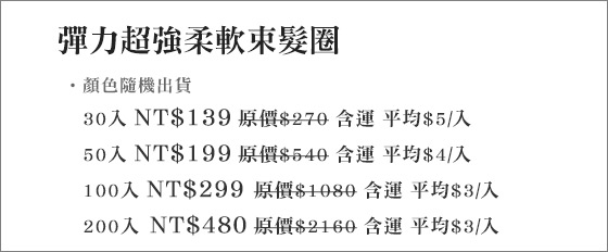 商品訊息簡述: 只要139元起(含運)即可購得原價最高2160元彈力超強柔軟束髮圈:30入/50入/100入/200入,顏色隨機出貨。